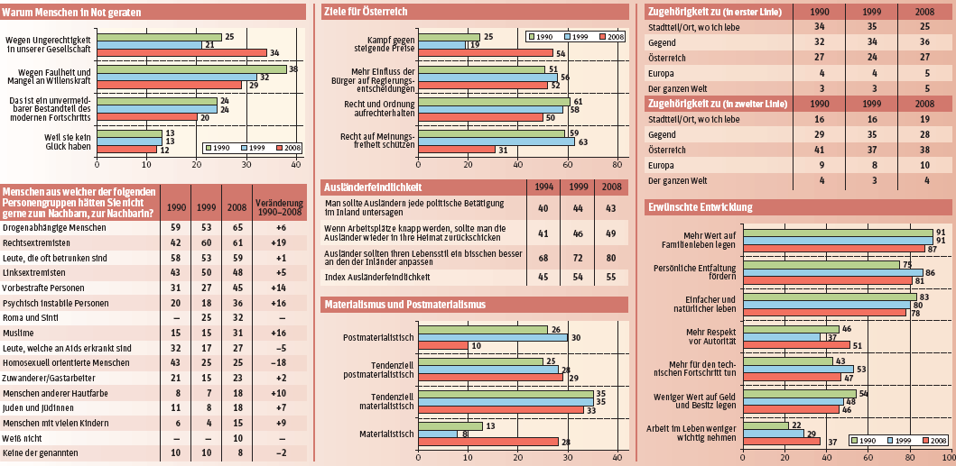 Das bedenkliche Ergebnis der Untersuchung lautet daher: Während die Gruppe der "Autoritären" hierzulande in den letzten Jahren "stetig und deutlich" gewachsen ist, sind die "liberalen Idealisten" mittlerweile noch weniger als früher geworden. (Nina Weißensteiner, DER STANDARD, Printausgabe, 15. Juni 2009)