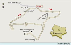 Die Route: Auffahrt von Ybbsitz zum Haselsteinhof, dort wählt man die rote Markierung, die in einem Bogen auf die Rückseite der Haselsteinwand führt, von wo man unmarkiert zur Oberkante des Felsens gelangt. Zurück zur roten Markierung und auf dieser weiter. Der zügig zur Höhe führende Steig mündet in einen Güterweg, der bei der Prochenberghütte endet. Gehzeit ab Haselsteinhof eineinhalb Stunden.