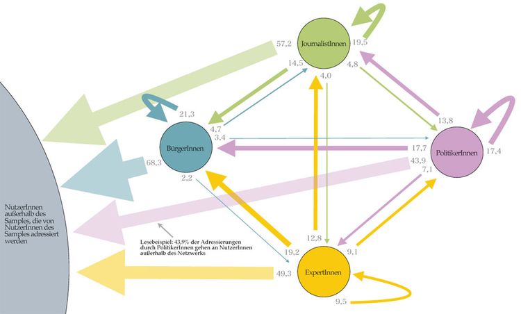 "JournalistInnen (19,5 Prozent) und PolitikerInnen (17,4 Prozent) adressieren ihresgleichen sehr stark. Alle Politik-Profis adressieren sowohl BürgerInnen innerhalb des Samples als auch NutzerInnen außerhalb des Netzwerk-Samples in hohem Maße." Lizenz: CC-BY-SA