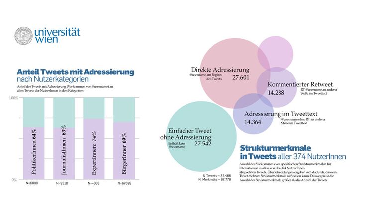 "Ein großer Teil der Tweets, die von den 374 NutzerInnen in unserer Studie gesendet wurden, enthalten irgendeine Form von Adressierung. Dies ist ein guter Indikator für eine hohe Interaktionsorientierung der politischen Twittersphäre. Dies gilt für alle Nutzerkategorien, wobei Tweets von BürgerInnen und ExpertInnen noch häufiger Adressierungen enthalten als jene von JournalistInnen und PolitikerInnen." Lizenz: CC-BY-SA