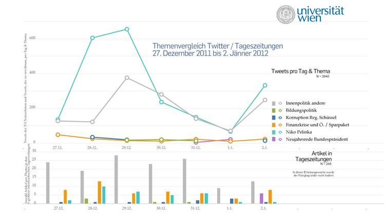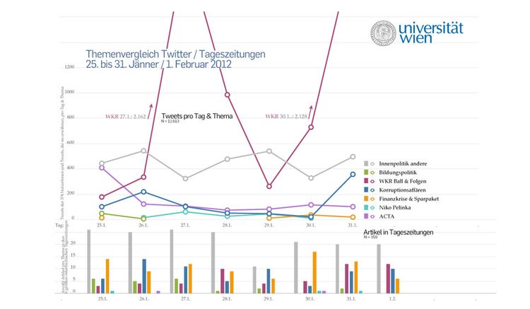 Von den 145.000 untersuchten Tweets handelte fast ein Fünftel von innenpolitischen Themen. Die dominierenden Diskurse des jeweiligen Untersuchungszeitraums (vier nicht zusammenhängende Wochen innerhalb des letzten Halbjahres) bildeten vor allem die Korruptionsaffären, die Occupy-Bewegung, die Causa Niko Pelinka und der Protest rund um den WKR-Ball. Besonders komplexe, langatmige Themen wie beispielsweise das Sparpaket waren auf Twitter im Vergleich zu den Massenmedien stark unterrepräsentiert. "Bei Twitter spielen die persönlichen Interessen des Journalisten eine größere Rolle - weniger der Auftrag, die Allgemeinheit zu informieren", erklärt Axel Maireder die Themenwahl.