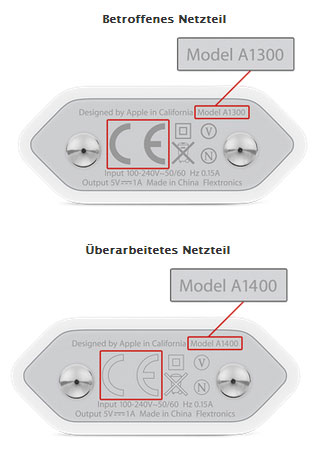 Ob es Vorfälle mit überhitzten Netzteilen gegeben hat, ist nicht bekannt. Apple spricht in einem Hinweis auf seiner Website davon, dass es "in seltenen Fällen" zur Überhitzung des europäische 5W-USB-Netzteils kommen könne. Man habe sich daher "aus eigenem Willen entschieden, jedes betroffene Netzteil kostenlos gegen ein neues, umgestaltetes Netzteil auszutauschen."