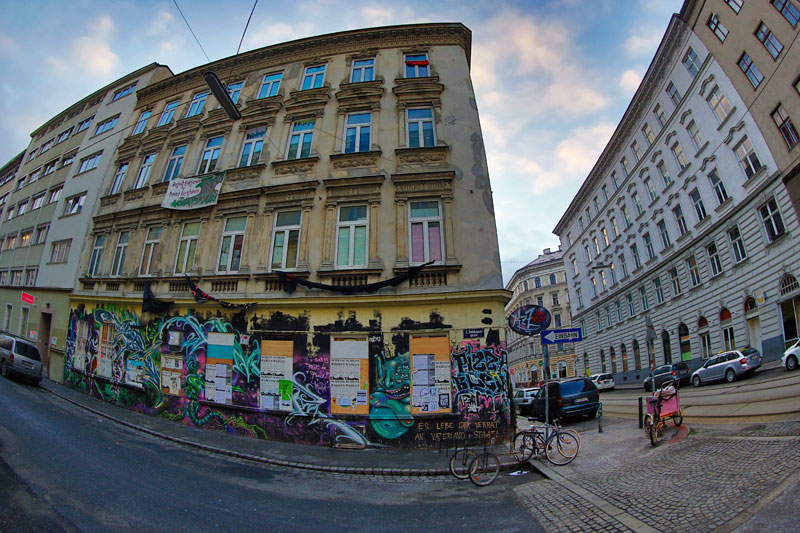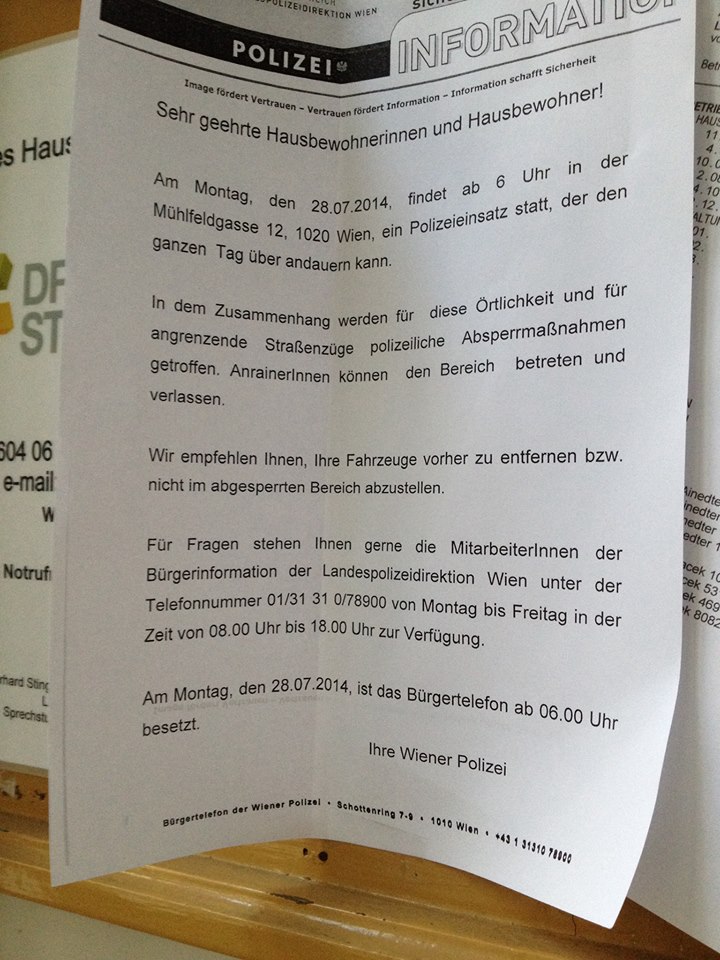 Wir und andere Journalisten haben wieder Zugang zur Ecke Fugbachgasse/Mühlfeldgasse und damit direkten Blick auf den Hauseingang bekommen. Äußerlich hat sich die Lage nicht geändert. Die Polizei versucht weiterhin, Zugang durch das verbarrikadierte Stiegenhaus zu bekommen.