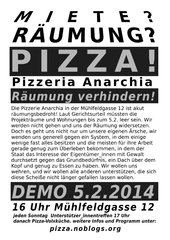 "Wir werden unser Möglichstes tun, um die Räumung zu verhindern", kündigten die Aktivisten am Donnerstag in einer Presseerklärung an. Sie riefen zu Solidarität und Unterstützung gegen die Räumung auf. (Michael Matzenberger; Mitarbeit: Anja Melzer, Maria von Usslar; derStandard.at, 28.7.2014)