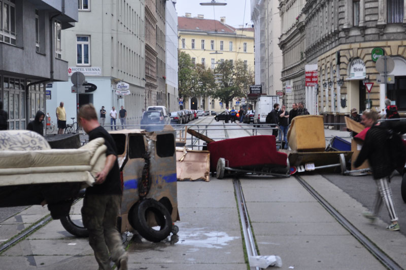 Die ersten Polizeieinheiten trafen am Montag gegen 5.30 Uhr rund um die Mühlfeldgasse 12 im zweiten Wiener Gemeindebezirk ein. Mehrere Dutzend Menschen befanden sich direkt vor dem Haus, manche übernachteten hier. Einige von ihnen verbarrikadierten gegen 6 Uhr mit zuvor von einem Polizei-Lkw abgeladenen, unbeaufsichtigen Absperrgittern den Abschnitt der Mühlfeldgasse direkt vor dem Haus. Die Möglichkeit der Entwendung bezeichnete die Polizei später als "logistischen Fehler.