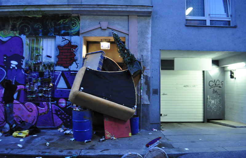 Die Polizisten kommen laufend mit Schlitten, Reifen, Türen, Ziegeln, Einkaufswagen, Getränkekisten, Leitern, zerlegten Möbeln und weiterem Material, mit dem die Besetzer die Gänge verbarrikadiert haben, aus dem Haus. Die MA 48 transportiert den Unrat mit Lastautos ab. Immer wieder wechseln sich Beamte schichtweise ab. Im Haus könnten sich laut Polizei auch Hunde befinden. Die Einsatzkräfte wollen die Operation heute noch zu Ende bringen, hieß es gegenüber derStandard.at.