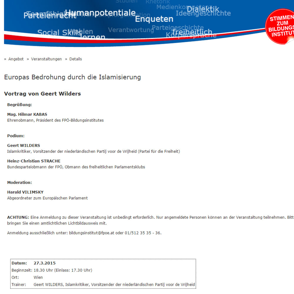 Wien – Die Parteiakademie der FPÖ lädt am 27. März zu einer Podiumsdiskussion unter dem Motto: "Europas Bedrohung durch die Islamisierung". Prominenter Vortragender ist der Rechtspopulist Geert Wilders, Vorsitzender der niederländischen Partij voor de Vrijheid (Partei für die Freiheit).
