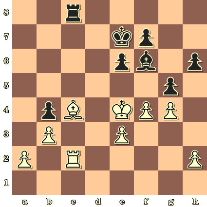 1.d4 d5 2.c4 c6 3.Sc3 Sf6 4.e3 a6 5.Ld3 dxc4 6.Lxc4 e6 7.Sf3 c5 8.O-O b5 9.Le2 Lb7 10.dxc5 Sc6 11.Sd2 Lxc5 12.Sde4 Sxe4 13.Sxe4 Le7 14.b3 Sb4 15.Lf3 O-O 16.La3 Tc8 17.Sf6+ Lxf6 18.Lxb7 Lxa1 19.Lxb4 Lf6 20.Lxf8 Dxd1 21.Txd1 Txf8 22.Lxa6 b4 23.Tc1 g6 24.Tc2 Ta8 25.Ld3 Td8 26.Le2 Kf8 27.Kf1 Ta8 28.Lc4 Tc8 29.Ke2 Ke7 30.f4 h6 31.Kf3 Tc7 32.g4 g5 33.Ke4 Tc8