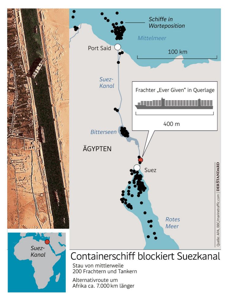 Besonders das Geschäft mit China dürfte unter der Blockade leiden. Das hatte zuletzt deutlich angezogen und der exportabhängigen Branche aus der Rezession geholfen. Gleichzeitig bestellen Europas Produzenten auf Hochdruck Fertigungsteile aus China: Der aktuelle Einkaufsmanagerindex für die Industrie in der Eurozone erreichte zu Wochenbeginn den höchsten Stand seit 1997, wie das Marktforschungsinstitut IHS Markit bekannt gab. Im Vorjahr passierten fast 19.000 Schiffe mit insgesamt mehr als einer Milliarde Tonnen Fracht den Kanal. Das entspricht zwölf Prozent des globalen Frachtvolumens und etwa 30 Prozent des Containervolumens.