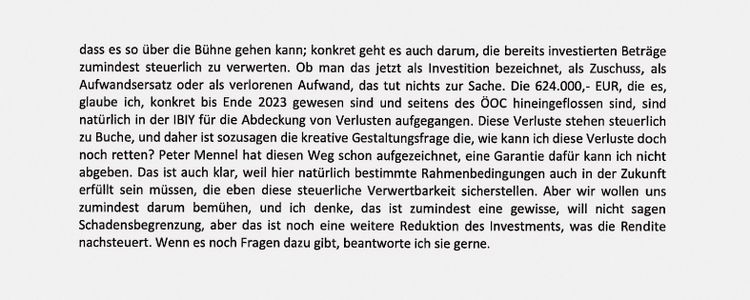 Mennel legte sich in der Hauptversammlung, anders als Houf, auf den Begriff "Forderungen" fest: ÖOC-Forderungen also an IBIY, die das ÖOC freilich "nachrangig gestellt" habe, "um eine bilanzielle Überschuldung der Gesellschaft zu vermeiden". Mennel weiters: "Darlehensvertrag wurde keiner abgeschlossen, da es als Zwischenfinanzierung gedacht war." Laut Houf sind die 624.000 Euro "natürlich in der IBIY für die Abdeckung von Verlusten aufgegangen. Diese Verluste stehen steuerlich zu Buche, und daher ist sozusagen die kreative Gestaltungsfrage die: Wie kann ich diese Verluste doch noch retten?"
