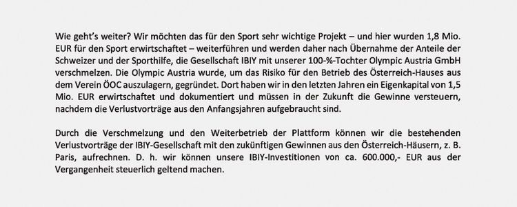 Mennels Lösung: Dabei soll die Olympic Austria GmbH helfen! Die nächste Gesellschaft, eine 100-prozentige ÖOC-Tochter noch dazu. Sie wurde laut Mennel "gegründet, um das Risiko des Betriebs des Österreich-Hauses aus dem Verein ÖOC auszulagern". Dabei erwirtschaften die Österreich-Häuser, in denen das ÖOC bei Olympischen Spielen als Gastgeber auftritt, ohnedies Gewinne. Sie werden u. a. von der Wirtschaftskammer und von Sponsoren finanziert. Laut Mennel wurde "in den letzten Jahren ein Eigenkapital von 1,5 Millionen Euro erwirtschaftet". Sein Plan: "Verschmelzung" der Olympic Austria GmbH mit IBIY. So ließen sich, glaubt er, "bestehende Verlustvorträge der IBIY-Gesellschaft mit den zukünftigen Gewinnen aus den Österreich-Häusern aufrechnen. Das heißt, wir können unsere IBIY-Investitionen" – Investitionen! – "von circa 600.000 Euro aus der Vergangenheit steuerlich geltend machen."